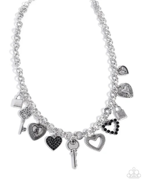 Dotted with black rhinestones, an assortment of romantic charms, including various silver keys, silver padlocks, and varying textured and high-sheen silver hearts, sway along an abstract, hammered, layered link chain for a vintage finish. Features an adjustable clasp closure.