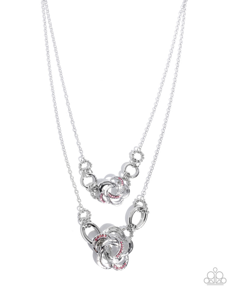 Two layers of dainty silver chains cascade below the neck, each featuring interwoven silver rings adorned with airy silver floral frames encrusted with pink rhinestones. The intricate circular designs create a dynamic and eye-catching layered look. Features an adjustable clasp closure.
